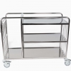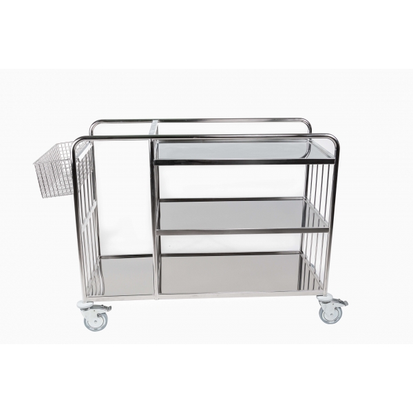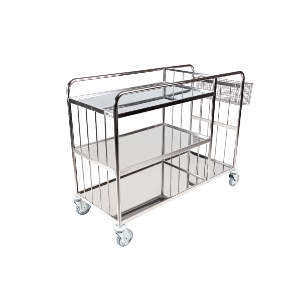 Trolley for the colection and distribution of linen art. 300440 divided in two parts, bigger one with 3 shelves, smaller one with 1 shelve, dim.1300x550x1050Hmm. Structure entirly made of AISI 304 stainless steel, Swivel wheels diameter 100 mm, 2 of which with breake.