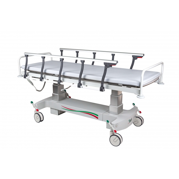 Electric stretcher - trolley art. 151010. All-purpose therapeutic strecher's size construction, up-to-date desigen and function enable easy moving around and transport of paciants. Mattress platform is in two section and offers the manual head rest adjustment 0-30°, trendelenbur and antitrendelenburg adjustment ±20° and height adjustment with two motors in the columns with a maximum lifting load of 200 kg.