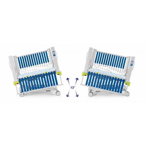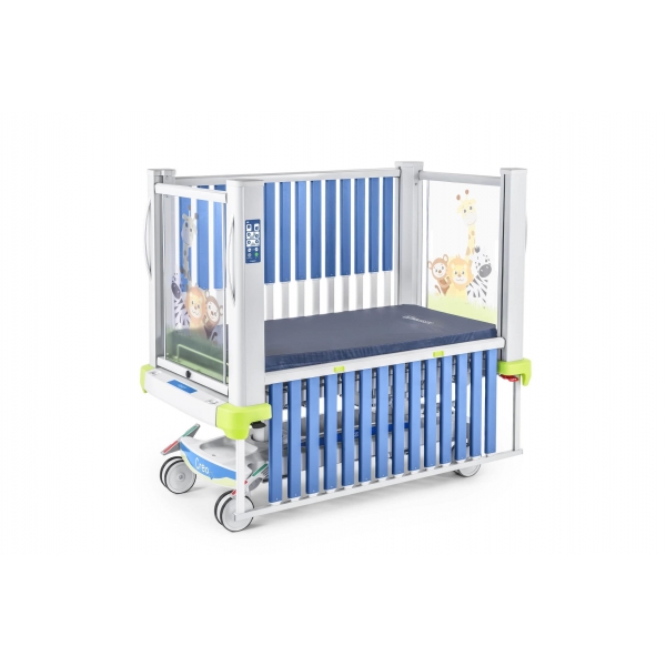 Creo je pediatrična postelja s tridelnim ležiščem, zasnovana za varno in udobno bolnišnično bivanje malih pacientov. Gre za posteljo z nastavljivo višino in visoko zaščitno ograjno konstrukcijo, ki nudi največjo možno varnost pediatričnim bolnikom.