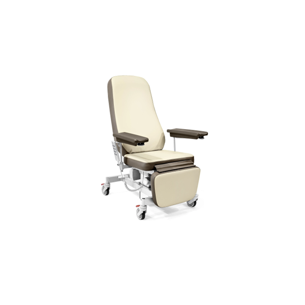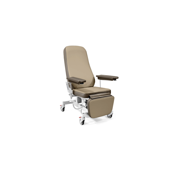 Popolnoma električni terapevtski in negovalni stol z nastavljivo višino. Večfunkcijska ročna upravljalna enota omogoča nastavitev višine, naslonjala za hrbet, naslonjala za noge in položaja Trendelenburg.
