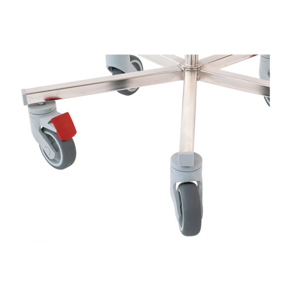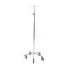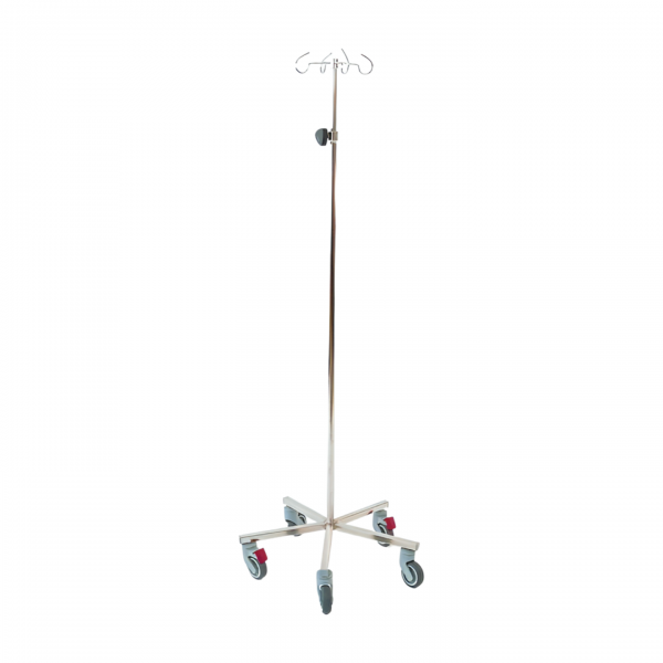 Prosto stoječe infuzijsko stojalo art. 400200. Stojalo je izdelano iz inox nerjavečega materiala, opremljeno je s teleskopsko nastavitvijo višine od 1300 mm do 2200 mm, s 4 obešalnimi kljukami in obteženim krakom s petimi kolesi fi 075 mm. Od tega pa imata dve kolesi zavoro.