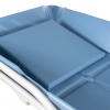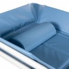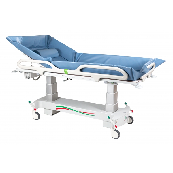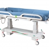 Voziček za tuširanje – električni art. 155030 - Dvodelno ležišče z možnostjo regulacije vzglavja od 0-30° ter z možnostjo postavitve v trendelenburg in antitrendelenburg položaj 20°. Samo ležišče vozička je nastavljivo po višini s pomočjo dveh stebrnih elektro motorjev. Konstrukcija vozička je izdelana iz jeklenih cevi in korozijsko zaščitena s kataforezo ter s končnim slojem s prašnim barvanjem po RAL lestvici. Podvozje vozička je zaščiteno z ABS pokrovi. Dim. 2050x800x510/910 Hmm. Regulacija višine od 510 do 910 mm s pomočjo ročne tastature preko elektromotorja Regulacija trendelenburg/antitrendelenburg položaja od 0° do+-20°s pomočjo ročne tastature preko elektromotorja Regulacija vzglavnega dela od 0° do 30° ročno s pomočjo plinskega cilindra Širina notranja 650 mm zunanja 815 mm Maksimalna dovoljena obremenitev 200 kg
